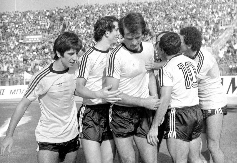 Ντούσαν Μπάγεβιτς, Θωμάς Μαύρος, Μίμης Παπαϊωάννου, Μίμης Δομάζος και Χρήστος Αρδίζογλου πανηγυρίζουν στην αναμέτρηση Ολυμπιακός - ΑΕΚ 0-1 (24/09/1978) ACTION IMAGES PRESS AGENCY
