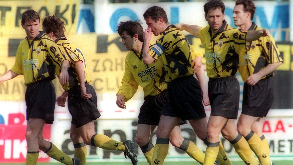 Πανηγυρικό στιγμιότυπο μετά από γκολ της ΑΕΚ στη νίκη με 4-2 επί της Νάουσας στην Α' Εθνική 1993-1994 (06/03/1994) ACTION IMAGES PRESS AGENCY