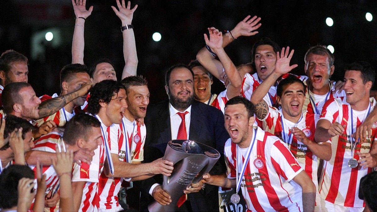 Ο Βαγγέλης Μαρινάκης και οι παίκτες του Ολυμπιακού με το τρόπαιο του πρωταθλητή της Super League 2011-2012, στη φιέστα του 'Γεώργιος Καραϊσκάκης' (09/05/2012) ACTION IMAGES PRESS AGENCY