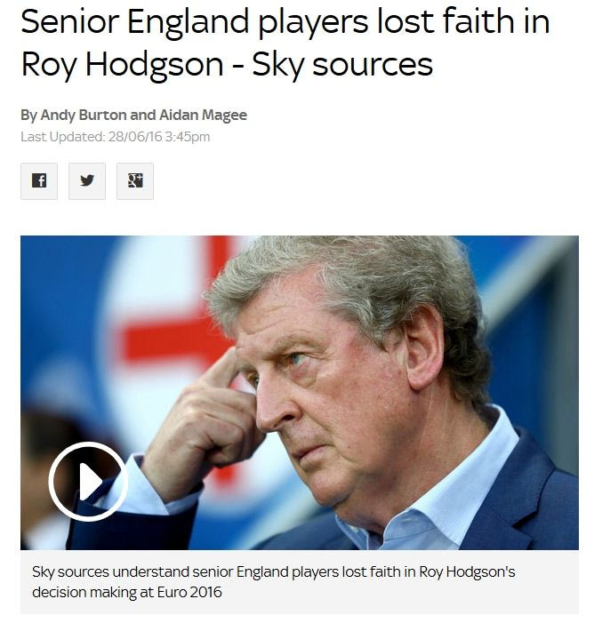 Σημερινό ρεπορτάζ του "Sky Sports" αποκαλύπτει πως οι έμπειροι ποδοσφαιριστές της εθνικής Αγγλίας αμφέβαλλαν για τις ηγετικές ικανότητες του Ρόι Χόντσον, προτού ακόμα έρθει ο ταπεινωτικός αποκλεισμός από την Ισλανδία.