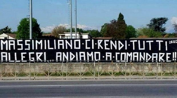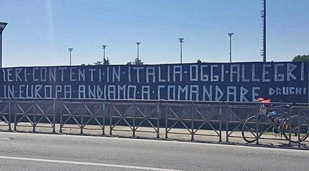 “Ieri Contenti in Italia, Oggi Allegri in Europa. Andiamo a comandare”, έγραφε το πανό (με τη λέξη Conte να “κρύβεται” μέσα στη λέξη contenti=ευχαριστημένοι), που μεταφράζεται ως εξής: “Χθες ευχαριστημένοι στην Ιταλία, σήμερα χαρούμενοι στην Ευρώπη. Πάμε να γίνουμε το αφεντικό”.
