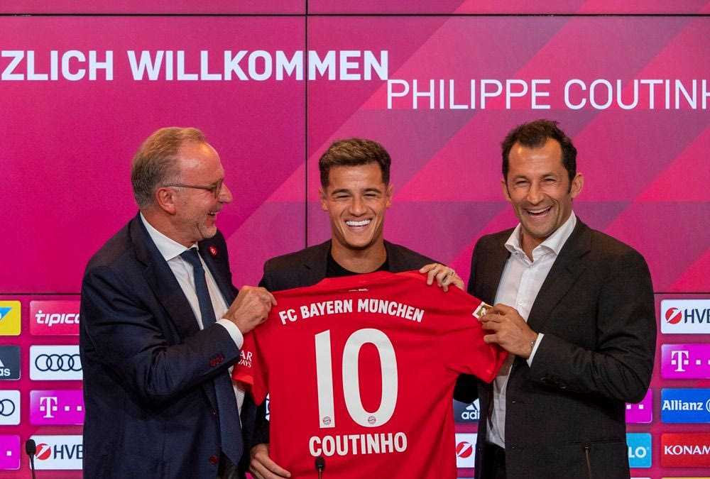 Ο Φιλίπε Κοουτίνιο κατά την παρουσίασή του από τη Μπάγερν, από τον πρόεδρο της ομάδας, Καρλ Χάιντς Ρουμενίγκε (αριστερά) και τον αθλητικό διευθυντή, Χασάν Σαλιχάμιτζιτς (δεξιά) στην 'Άλιαντς Αρένα', Μόναχο, Δευτέρα 19 Αυγούστου 2019 Peter Kneffel/dpa via AP