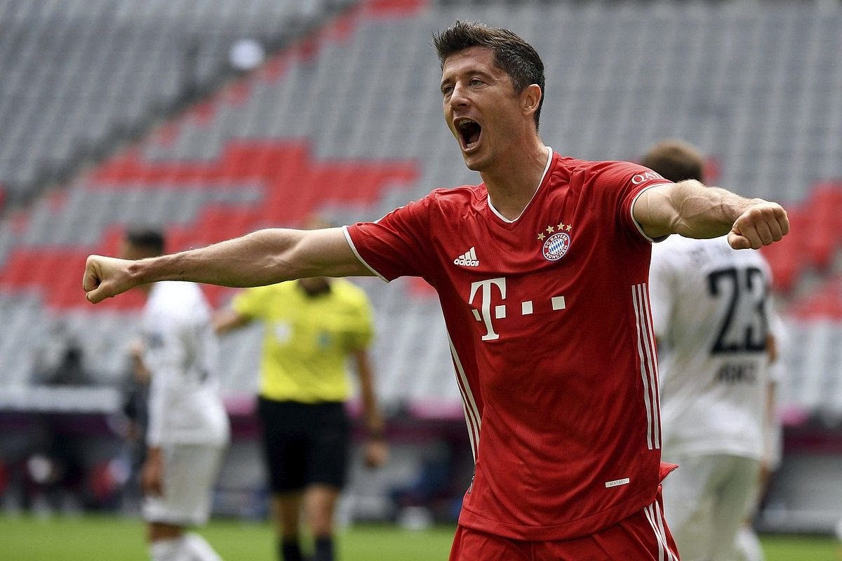 Ο Ρόμπερτ Λεβαντόβσκι της Μπάγερν Μονάχου πανηγυρίζει γκολ που σημείωσε κόντρα στη Φράιμπουργκ για την Bundesliga 2019-2020 στην 'Άλιαντς Αρένα', Μόναχο | Σάββατο 20 Ιουνίου 2020 dpa via AP/Sven Hoppe