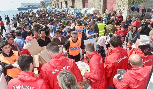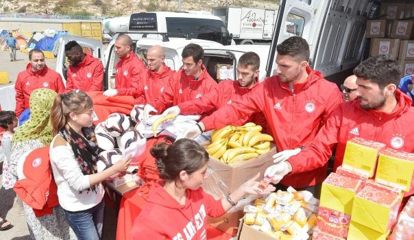Για ακόμα μία ημέρα ο Ολυμπιακός προσφέρει τρόφιμα στους πρόσφυγες του Πειραιά, αυτήν τη φορά με την αρωγή ποδοσφαιριστών.
