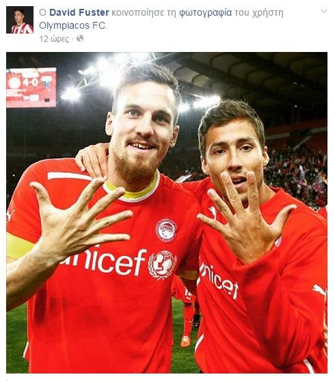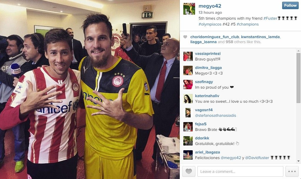 Οι Μπάλαζ Μέγιερι και Νταβίντ Φουστέρ δείχνουν με τα χέρια τα 5 πρωταθλήματα που έχουν κατακτήσει με τον Ολυμπιακό. “Πέντε φορές πρωταθλητές με τον φίλο μου, Φουστέρ”, αναφέρει ο Ούγγρος γκολκίπερ.
