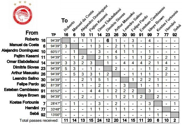 Ενώ για τον Ολυμπιακό, οι Σιόβας και Ρομπέρτο συνδυάστηκαν συνολικά 6 φορές (τις περισσότερες) κάτι που δείχνει πως οι χώροι από την άμυνα και μπροστά ήταν περιορισμένοι: