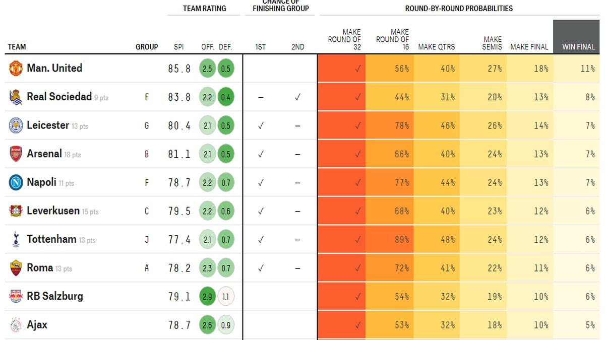 Η μεθοδολογία του fivethirtyeight και τα SPI ratings είναι κάτι που μπορείτε να διαβάσετε εδώ. Με βάση αυτό το μοντέλο υπολογισμού πιθανοτήτων, η Μάντσεστερ Γιουνάιτεντ προβάλλει ως πρώτο φαβορί για την κατάκτηση της διοργάνωσης. Η ομάδα του Σόλσκιερ δύσκολα θα καταφέρει να φτάσει την Μάντσεστερ Σίτι στη μάχη της Premier League, ωστόσο διαθέτει ένα ρόστερ που μπορεί να την βοηθήσει να επαναλάβει τον θρίαμβο του 2017, υπό τις οδηγίες τότε του Ζοζέ Μουρίνιο. Ντε Χέα, Πογκμπά, Ράσφορντ, Φερνάντες, Μαρσιάλ, Καβάνι, είναι μεταξύ άλλων τα αστέρια που χαρίζουν στους ‘κόκκινους διαβόλους’ αυτό το 11%, το υψηλότερο ποσοστό κατάκτησης του θεσμού μεταξύ των 32 συμμετεχόντων.
