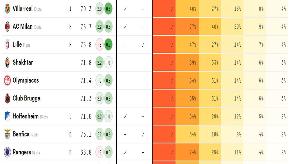 Εντούτοις το πόσο ‘καλή’ ή ‘κακή’ είναι μια κλήρωση αποδεικνύεται στο χορτάρι, κάτι που θα κληθείνα πράξει και ο Ολυμπιακός. Το λέει το μοντέλο πιθανοτήτων του SPI ratings για τους Πειραιώτες; Ότι έχουν 64% να προκριθούν στους 16, 31% να φτάσουν στα προημιτελικά, 14% να προχωρήσουν ως τα ημιτελικά, 6% να δώσουν το παρών στον τελικό και 3% να κατακτήσουν το τρόπαιο.