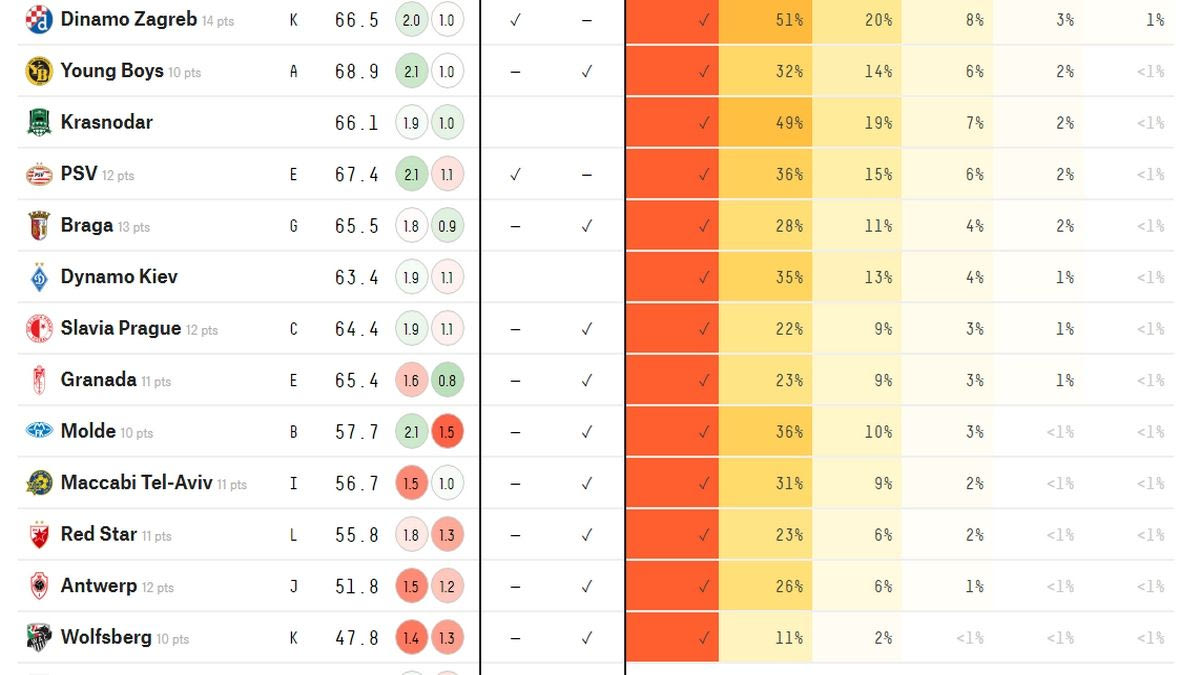 Η Ντίναμο Ζάγκρεμπ είναι η τελευταία ομάδα του συγκεκριμένου συστήματος αξιολόγησης που συγκεντρώνει μια ολόκληρη τουλάχιστον ποσοστιαία μονάδα πιθανοτήτων. Γιουνγκ Μπόις, Κράσνονταρ, Αϊντχόφεν, Μπράγκα, Ντινάμο Κιέβου, Σλάβια Πράγας, Γρανάδα, Μόλντε, Μακάμπι Τελ Αβίβ, Ερυθρός Αστέρας, Άντβερπ και Βόλφσμπεργκερ, συγκεντρώνουν λιγότερο από 1% για να κατακτήσουν του τρόπαιο.