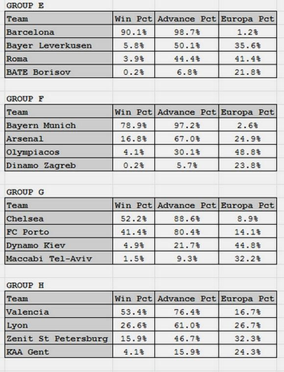 Η περίφημη στατιστική υπηρεσία του ESPN, έχοντας γρήγορα αντανακλαστικά, παρουσίασε τις πιθανότητες κάθε ομάδας στου ομίλους του Champions League.