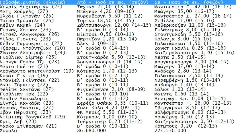 Το σύνολο των 27 πωλήσεων σε αυτό το διάστημα ανέρχεται σε 227.530.000. Το κόστος αγοράς των παικτών ανέρχεται σε 86.680.000 και το ισοζύγιο είναι θετικό κατά 140.850.000.
