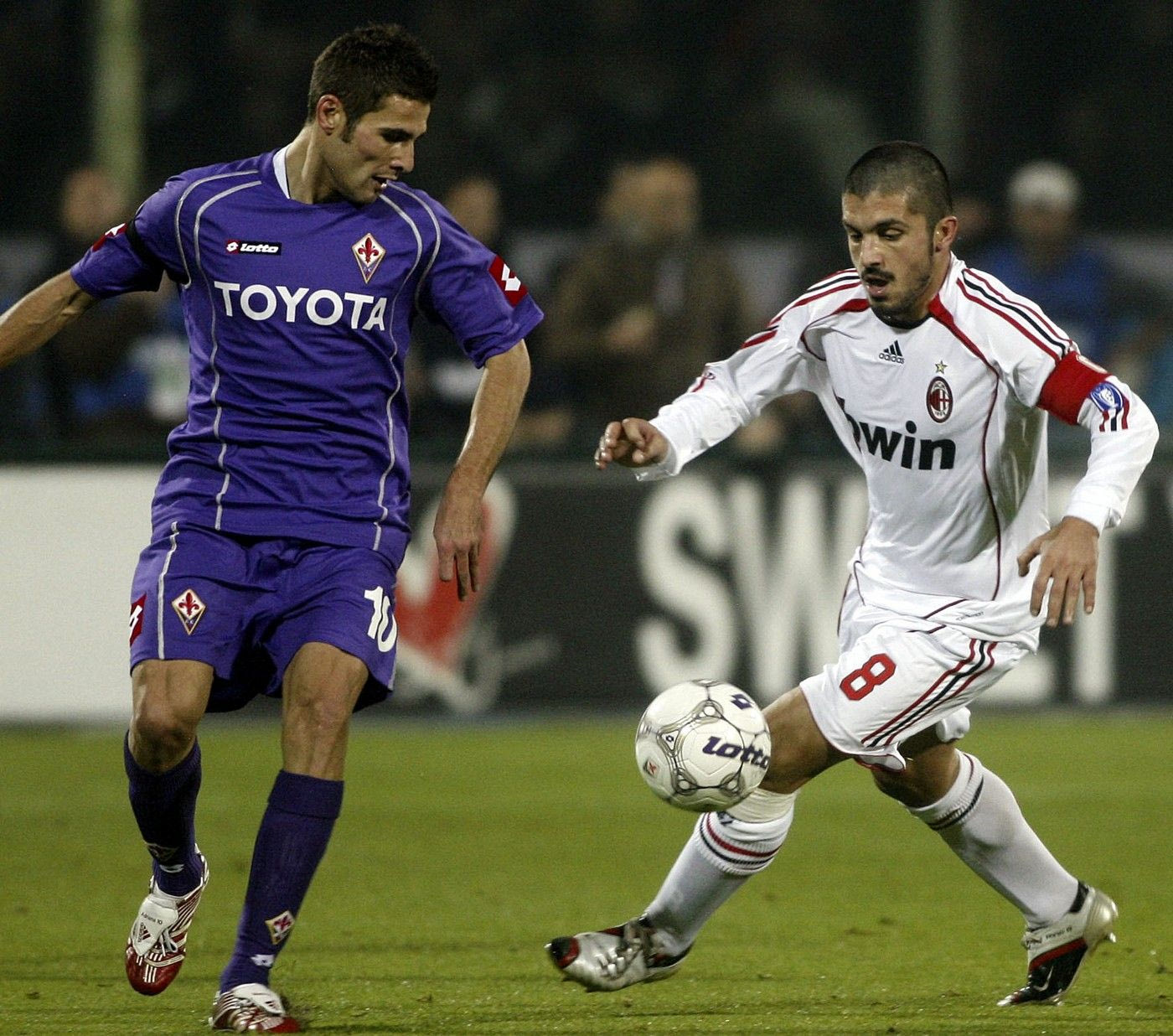 O Άντριαν Μούτου με τη φανέλα της Φιορεντίνα κοντρολάρει την μπάλα, ενώ ο Τζενάρο Γκατούζο της Μίλαν τον μαρκάρει στενά AP Photo/Fabrizio Giovannozzi