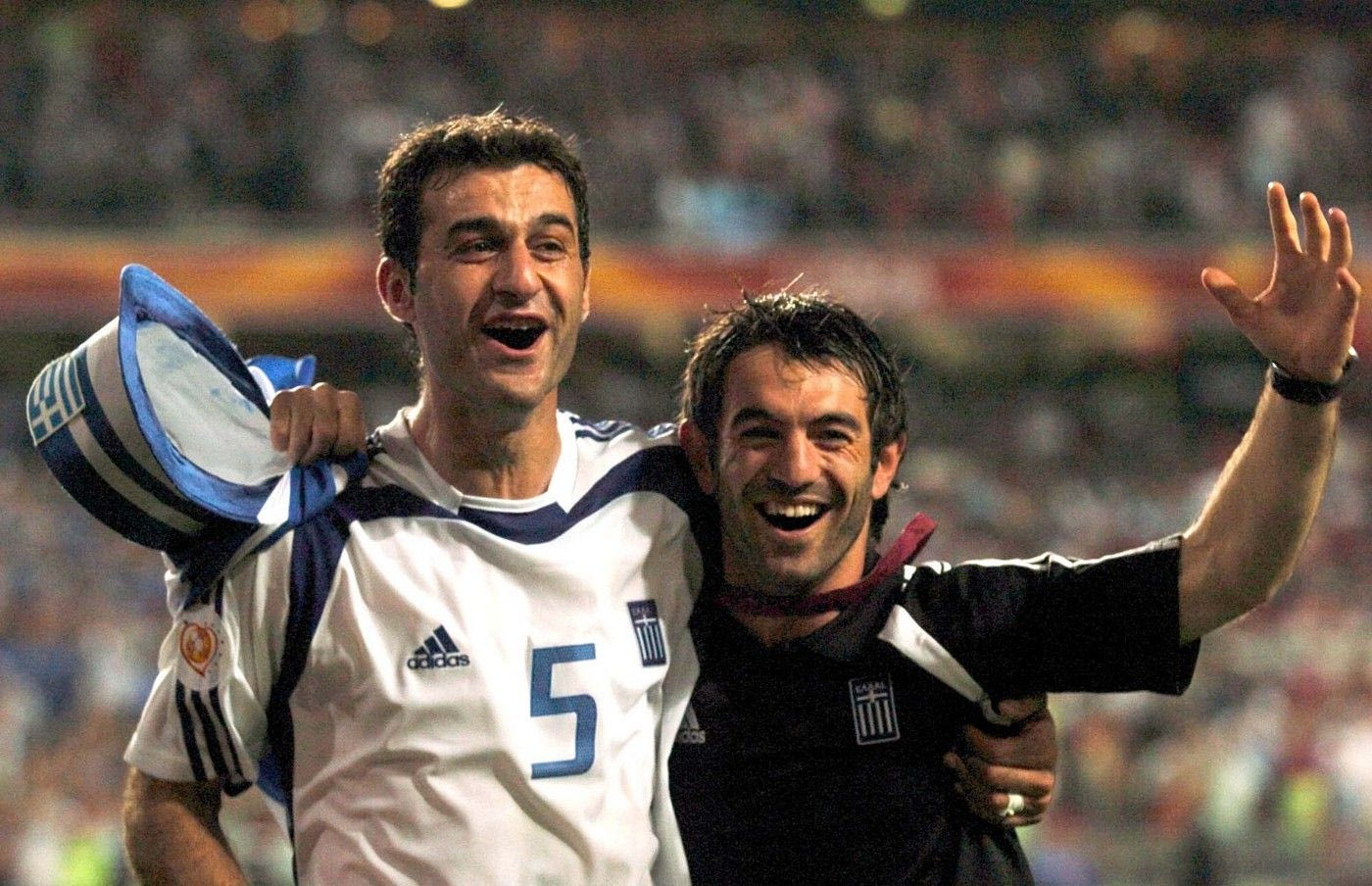 O Τραιανός Δέλλας μαζί με τον Γιώργο Καραγκούνη πανηγυρίζουν τη νίκη της Εθνικής Ελλάδας κόντρα στην Πορτογαλία στον τελικό του Euro 2004 AP Photo/Dusan Vranic
