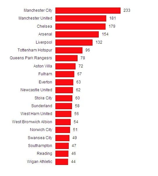Στο μισθολογικό κόστος η Μάντσεστερ Σίτι έχει τα πρωτεία με 233 εκατομμύρια λίρες. Ακολουθεί η Γιουνάιτεντ με 181 και αμέσως μετά η Τσέλσι με 179. Τελευταία εκείνη τη σεζόν ήταν η Γουίγκαν που πλήρωσε για μισθούς μόλις 44 εκατομμύρια λίρες.