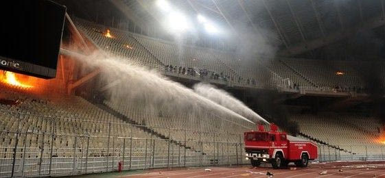 Σοβαρές διαταραχές είχαν γίνει τον Μάρτιο του 2012 σε ένα ματς που είχε γίνει στην τότε έδρα του Παναθηναϊκού, το ΟΑΚΑ. Η έναρξη του δευτέρου ημιχρόνου καθυστέρησε 45 λεπτά, διότι οι οπαδοί πετούσαν στην αστυνομία βόμβες μολότοφ και φωτοβολίδες, ενώ στην συνέχεια το παιχνίδι διακόπηκε οριστικά. Είκοσι αστυνομικοί τραυματίστηκαν, έγιναν πάνω από 50 συλλήψεις, ενώ τρία πυροσβεστικά οχήματα κλήθηκαν να σβήσουν τις φλόγες”