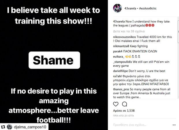 “Πιστεύω πως όλη αυτήν την εβδομάδα προπονούνταν γι΄αυτό το σόου. Ντροπή. Αν δεν θέλετε να να παίζετε σε αυτήν την εκπληκτική ατμόσφαιρα, καλύτερα αφήστε το ποδόσφαιρο”, τόνισε με ποστάρισμα στο Ιnstagram o Τζάλμα Κάμπος, ενώ ο Φερνάντο Βαρέλα ανέβασε χρησιμοποιήσε τα λόγια του Ανγκολέζου εξτρέμ, σχολιάζοντας με δηκτικό τρόπο: “Τώρα κατάλαβα πως παίρνουν τα πρωταθλήματα (σ.σ. παλιάτσοι)”.