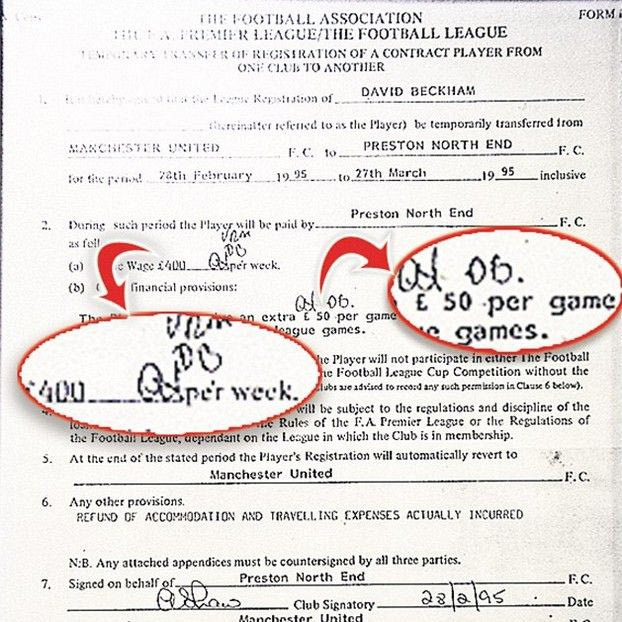 Το συμβόλαιο που υπέγραψε με την Πρέστον όταν δόθηκε δανεικός τον Φεβρουάριο του 1995 ας πούμε προέβλεπε εβδομαδιαίες αποδοχές μόλις 400 λιρών.