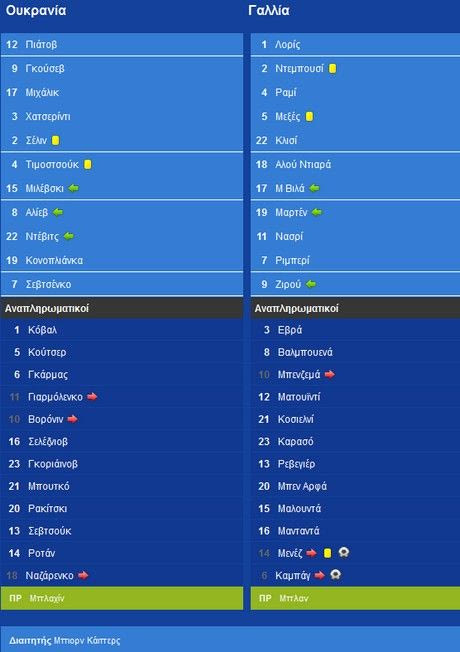 Η Γαλλία ήθελε την μπάλα στα πόδια για να αισθάνεται ασφαλής και αυτό έκανε. Απέναντι σε μια Ουκρανία που έκανε εύκολα το λάθος οι καλοί τεχνίτες των “τρικολόρ” είχαν τον έλεγχο και επέβαλαν το δικό τους τέμπο στο τερέν, που σε λιγότερο από μια ώρα είχε στεγνώσει από την ακατάπαυστη βροχή. Αν και το γκολ του Μενέζ στο 16′ ακυρώθηκε σωστά ως οφ σάιντ, ήταν φανερό πως το συγκρότημα του Μπλαν είχε πολλές περισσότερες πιθανότητες να βρει δίχτυα.