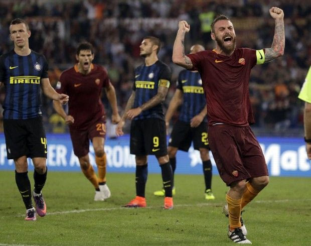 Roma's Daniele De Rossi celebrates after his teammate Kostas Manolas scored during a Serie A soccer match between Roma and Inter Milan, at Rome's Olympic Stadium, Sunday, Oct. 2, 2016. (AP Photo/Andrew Medichini) AP