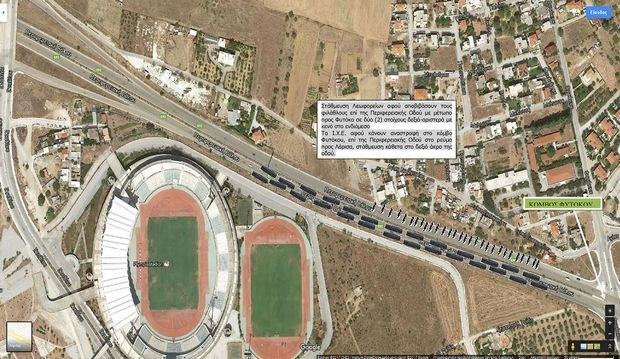 Οι φίλαθλοι που θα προσέλθουν με τα δικά τους οχήματα, θα αποβιβάζονται στον κόμβο του περιφερειακού με το Πανθεσσαλικό Στάδιο, και ο οδηγός θα συνεχίζει, προκειμένου να παρκάρει σύμφωνα με τις οδηγίες της Τροχαίας Βόλου, στο ρεύμα του περιφερειακού με κατεύθυνση προς Λάρισα, όπως φαίνεται και στο γραφικό που ακολουθεί: