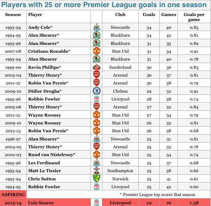 Μία από τις καλύτερες σεζόν της καριέρας του διανύει ο Λουίς Σουάρες, ο οποίος έχει σημειώσει 22 γκολ σε 16 αγώνες και μπορεί να βρεθεί στην πρώτη θέση των πρώτων σκόρερ της Premier League πάνω από τον Άντι Κόουλ, εάν συνεχίσει να σκοράρει με τον ίδιο ρυθμό.