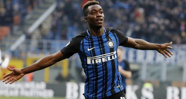 Inter Milan's Yann Karamoh, second from left, celebrates with his teammates after scoring his side's second goal during the Serie A soccer match between Inter Milan and Bologna at the San Siro stadium in Milan, Italy, Sunday, Feb. 11, 2018. (AP Photo/Antonio Calanni)