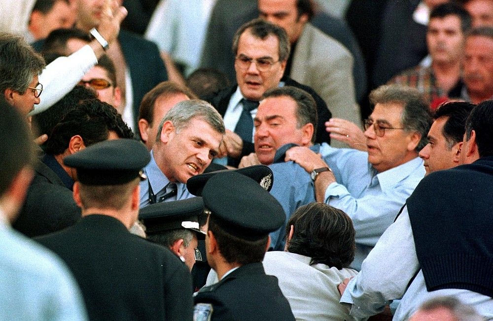 Την ώρα που ο διαιτητής Ψυχομάνης τιμωρούσε Ρε και Μπασινά με κόκκινη κάρτα, η ένταση μεταφερόταν αυτούσια, αλλά με διαφορετικούς πρωταγωνιστές, στην εξέδρα των επισήμων. Δημήτρης Μελισσανίδης (που είχε αναλάβει το μάνατζμεντ) και Γιώργος Βαρδινογιάννης ήταν τα κεντρικά πρόσωπα. Οι πέριξ αυτών αντάλλασσαν χτυπήματα, σακάκια τραβιούνταν, καρέκλες εκτοξεύονταν. Ο Μίμης Δομάζος δεν γλίτωσε και επιχείρησε να απαντήσει. Ο Μελισσανίδης φυγαδευόταν στην κερκίδα των οπαδών της ΑΕΚ ενόσω ο Γιώργος Βαρδινογιάννης κατηγορούσε την αντίπαλη ‘φρουρά’ του για ό,τι έχει προκύψει. Βαριές κουβέντες. Τα λόγια του είχαν καταγραφεί από κάμερα, αλλά ζήτησε και πήρε το υλικό.