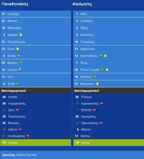 Ο Δώνης δεν είχε προλάβει να αποκομίσει κέρδος κάτι από την την αλλαγή του Καραγκούνη με τον Μπάλλα για μια πιο αμυντική ενδεκάδα και έριξε διαδοχικά στη μάχη τους Αναστασάκο και Πίτου Γκαρσία για να… προλάβει τουλάχιστον την ισοπαλία. Βρήκε δύο ευκαιρίες στο τελευταίο 10λεπτο με δράστη τον Τάτο, αλλά αλήθεια είναι πως ο Παναθηναϊκός διαχειρίστηκε το προβάδισμά του, έπαιξε με το χρόνο, αν και θα μπορούσε να είχε εκμεταλλευτεί διαφορετικά τους κενούς χώρους στον ανοικτό Ατρόμητο.
