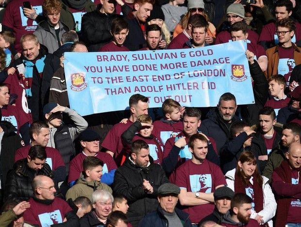“Μπράντι, Σάλιβαν & Γκολντ (σ.σ, η αναφορά ήταν για ιδιοκτήτη, πρόεδρο και αντιπρόεδρο), έχετε κάνει μεγαλύτερη ζημιά στο Ανατολικό Λονδίνο από τον Αδόλφο Χίτλερ, Έξω”, έγραφε πανό που υψώθηκε από τους οπαδούς.