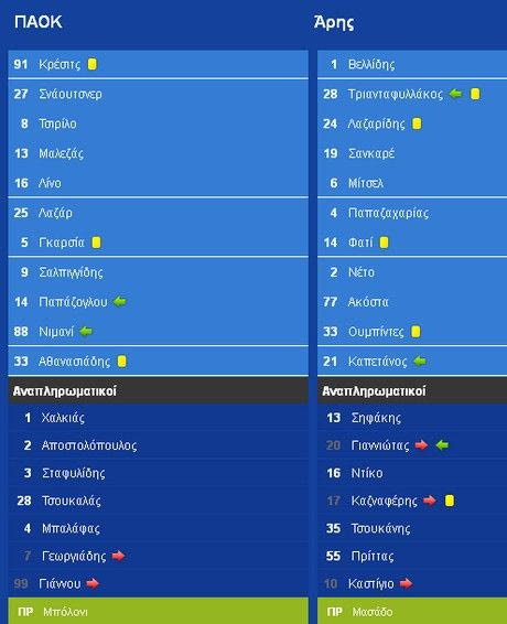Κίτρινες κάρτες: Γκαρσία (14′, ΠΑΟΚ), Κρέσιτς (63′, Άρης), Καζανφέρης (6′, Άρης), Λαζαρίδης (18′, Άρης), Φατί (37′, Άρης), Ουμπίδες (68′, Άρης).