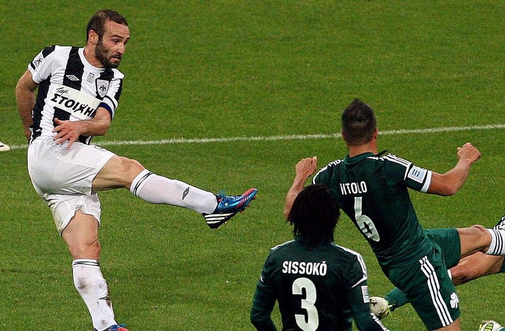 Ο Δημήτρης Σαλπιγγίδης εκτελεί ως παίκτης του ΠΑΟΚ, πιεζόμενος από τον Βίκτορ Βιτόλο ACTION IMAGES PRESS AGENCY