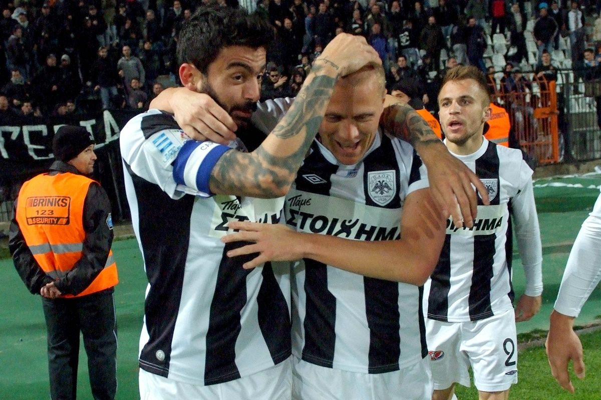 Ο Ζβόνιμιρ Βούκιτς του ΠΑΟΚ πανηγυρίζει με τον Στέφανο Αθανασιάδη γκολ που σημείωσε κόντρα στον Παναθηναϊκό για τη Super League 2012-2013 στο γήπεδο της Τούμπας | Κυριακή 17 Μαρτίου 2013 Eurokinissi Sports/Χρήστος Σιάρρης