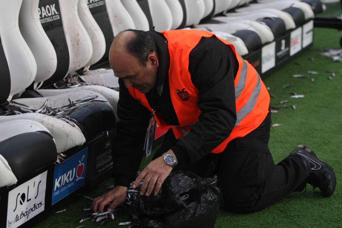 Πριν από τη σέντρα του αγώνα, η εικόνα με τους απλωμένους γαύρους στον πάγκο του Ολυμπιακού ήταν το πρώτο highlight της βραδιάς. Το ματς άρχισε με πάνω από μία ώρα καθυστέρηση, γιατί κάποιοι οπαδοί των γηπεδούχων είχαν αφήσει 5 κιλά γαύρο, κάνοντας αδύνατη την όποια προσπάθεια για ανάσα σε ακτίνα πολλών μέτρων. Εικόνα που δεν είναι άγνωστη στο δύσμοιρο ελληνικό ποδόσφαιρο, αφού αν γυρίσουμε τον χρόνο πίσω, το 1994 για παράδειγμα, θα θυμηθούμε μία αντίστοιχη κίνηση του Ολυμπιακού σε ντέρμπι με τον Παναθηναϊκό, όταν κάποιοι άλειψαν τον πάγκο των ‘πράσινων’ με βαζελίνη, πριν από τη σέντρα της αναμέτρησης στο (τότε) στάδιο ‘Καραϊσκάκη’.