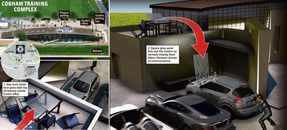 Όπως αποκάλυψε η αγγλική εφημερίδα “Sun”, ένας δυνατός αέρας είχε ως αποτέλεσμα να πέσει ένα γυάλινο τραπέζι από την ταράτσα του προπονητικού κέντρου των Λονδρέζων στο Κόμπαμ, με το τραπέζι να προσγειώνεται στο μπροστινό μέρος του αμαξιού του Κόντε (ένα Nissan Juke) και να του προξενεί υλικές ζημιές χιλιάδων λιρών.