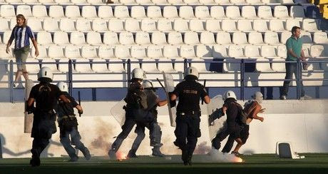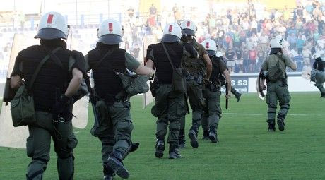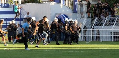 Λίγες στιγμές αργότερα τρεις διμοιρίες των ΜΑΤ επέβαλαν την τάξη, απωθώντας τους φίλους των γηπεδούχων, ωστόσο οι ανταλλαγές αντικειμένων συνεχίστηκαν από τις εξέδρες.