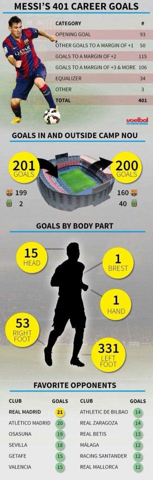 Ο Λιονέλ Μέσι πέτυχε το υπ' αριθμόν 401 γκολ με τη φανέλα της Μπαρτσελόνα και της Αργεντινής το σαββατοκύριακο, βάζοντας πλώρη να σπάσει το μετά το άλλο. Διαβάστε τα απίστευτα στατιστικά του σούπερ-σταρ των Μπλαουγκράνα και την... ιδιαίτερη "αγάπη" του προς τη Ρεάλ Μαδρίτης.