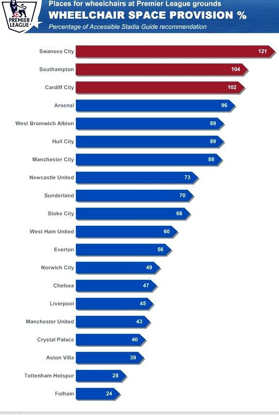 Η κατάταξη των αγγλικών ομάδων σύμφωνα με το αριθμό θέσεων που προσφέρουν σε άτομα με ειδικές ανάγκες βάσει του νόμου