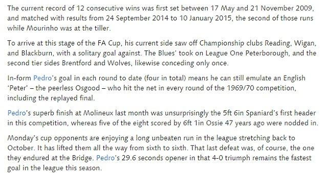 Και αυτό γιατί στην προαναγγελία του αγώνα ανέφερε μεταξύ άλλων: “Οι αντίπαλοί μας την ερχόμενη Δευτέρα απολαμβάνουν ένα μεγάλο αήττητο από τον Οκτώβριο. Τους έφερε από την 6η θέση στην 6η θέση. Φυσικά η τελευταία τους ήττα ήρθε στο “Bridge” με το γκολ του Πέδρο στα 29.6 δευτερόλεπτα στον θρίαμβο με 4-0 να παραμένει το γρηγορότερο γκολ στη σεζόν”.