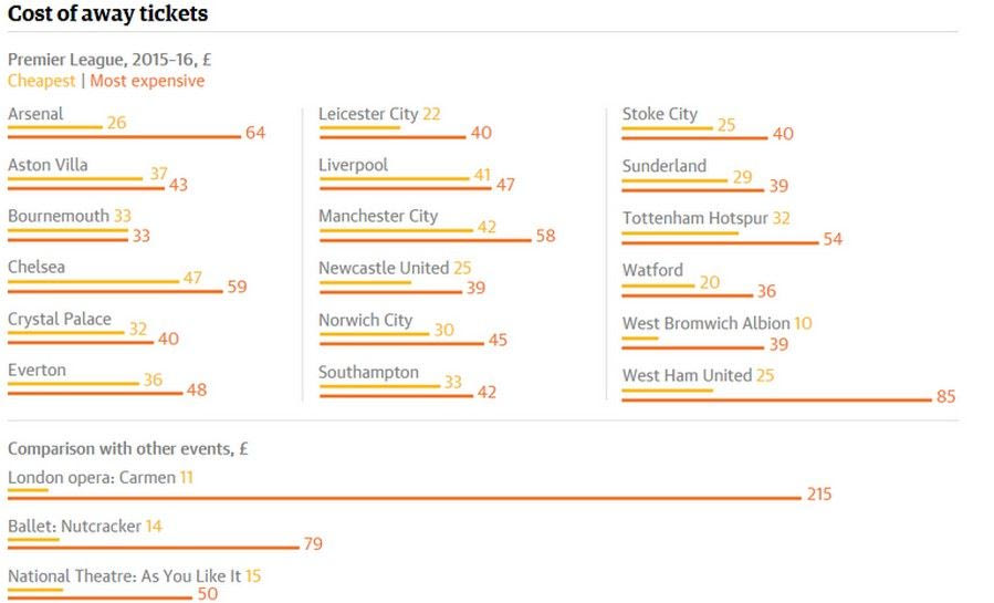 Την Τετάρτη ο “Guardian” πήγε την υπόθεση ακόμα πιο μακριά αποδεικνύοντας στην πράξη ότι το να βλέπει κανείς ποδόσφαιρο στην Αγγλία δια ζώσης είναι ένα πολύ ακριβό χόμπι, πιο ακριβό ακόμα και από την όπερα!