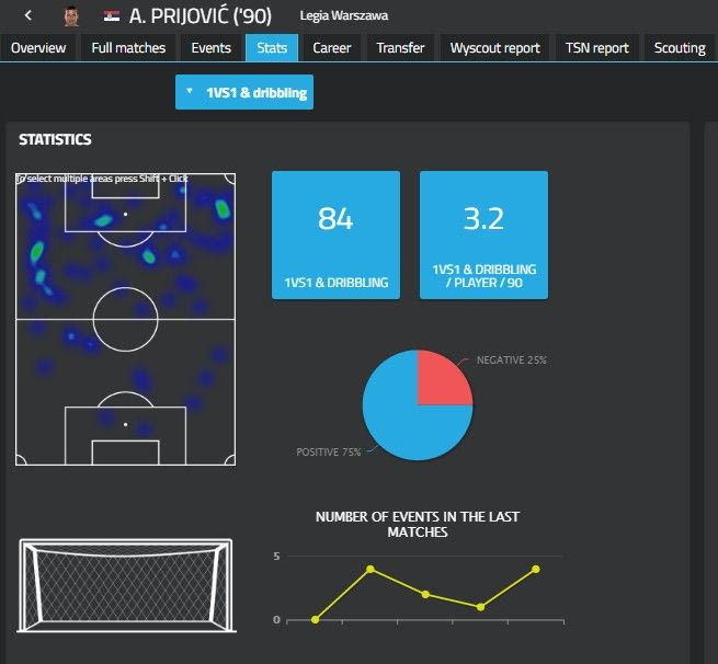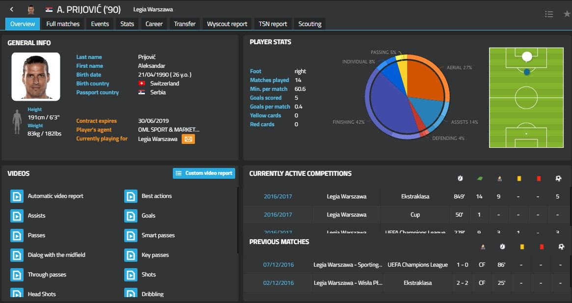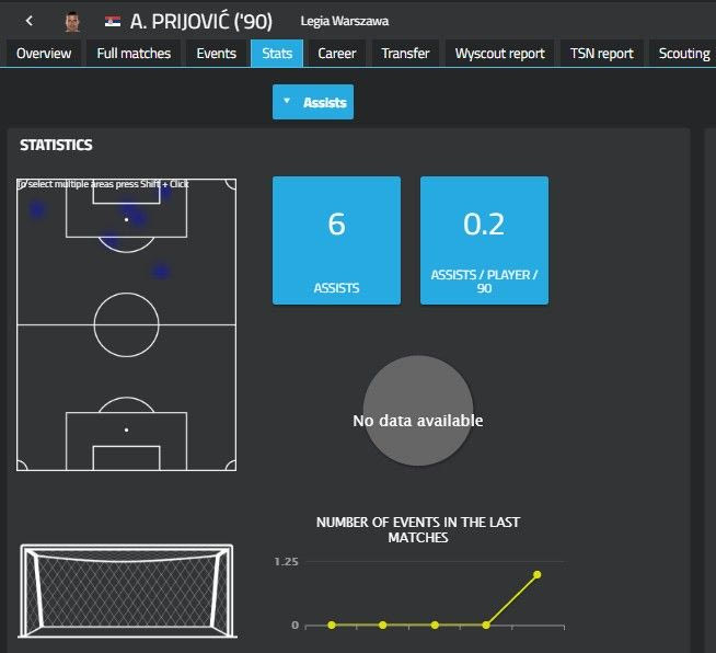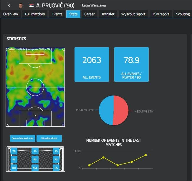 Με την βοήθεια του “Wyscout”, έρχεται η ανάλυση του Αλεξάντρ Πρίγιοβιτς, που μετρά φέτος 14 συμμετοχές στο πρωτάθλημα, έχοντας πέντε γκολ και δυο ασίστ, με μέσο όρο 60λεπτά συμμετοχής ανά παιχνίδι. Σε αυτά τα συνολικά 849 λεπτά παιχνιδιού για την πρώτη κατηγορία της Πολωνίας τα ποσοστά συμμετοχής του στο παιχνίδι χωρίζονται σε: 42% τελικές προσπάθειες, 27% κεφαλιές (κάτι αναμενόμενο λόγω του ύψους του), 14% ασίστ, 8% ατομικές ενέργειες, 5% πάσες, 4% αμυντικές κινήσεις.