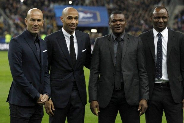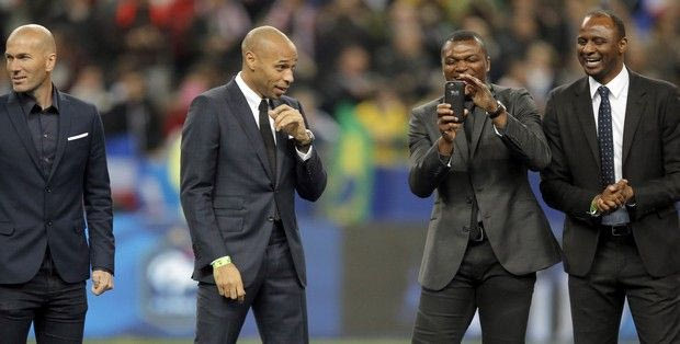 Former France's soccer players Zinedine Zidane, Thierry Henry, Marcel Desailly and Patrick Vieira, from left, are honored prior to the international friendly soccer match between France and Brazil at the Stade de France, north of Paris, France, Thursday, March 26, 2015. (AP Photo/Francois Mori) AP Photo/Francois Mori