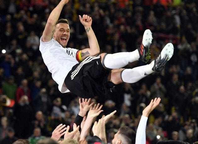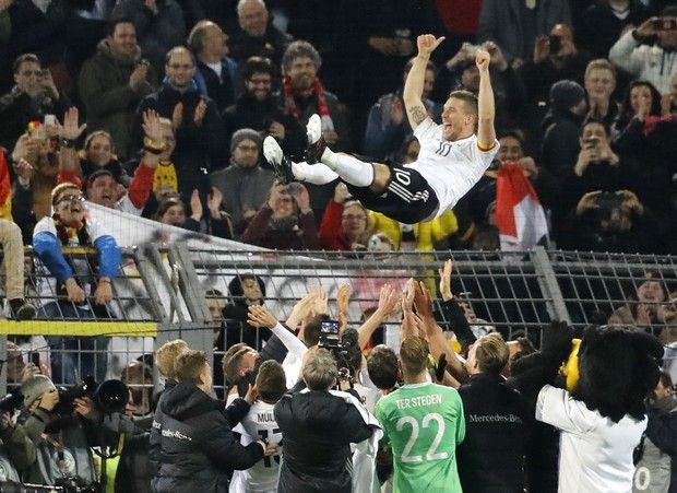Germany's Lukas Podolski is thrown up in the air by his teammates after the friendly soccer match between Germany and England in Dortmund, Germany, Wednesday, March 22, 2017. (AP Photo/Martin Meissner) AP Photo/Martin Meissner