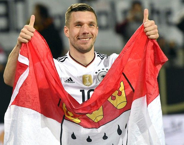 Germany's Lukas Podolski holds a flag of the German city of Cologne after the friendly soccer match between Germany and England in Dortmund, Germany, Wednesday, March 22, 2017. (AP Photo/Martin Meissner) AP Photo/Martin Meissner