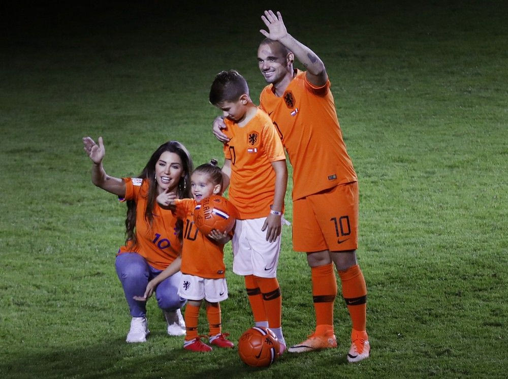 Wesley Sneijder of The Netherlands greets fans as he walks off the pitch with his wife Yolanthe, left, and his children Xess Xava, second left, and Jessey, second right, as he retires from international soccer after the international friendly soccer match between The Netherlands and Peru at the Johan Cruijff ArenA in Amsterdam, Netherlands, Thursday, Sept. 6, 2018. The friendly against Peru is the 134th and last for 34-year-old Sneijder, a Dutch record. His first international was a 1-1 draw with Portugal on April 30, 2003. The attacking midfielder has played for clubs including Ajax, Real Madrid and Inter Milan. (AP Photo/Peter Dejong) AP Photo/Peter Dejong