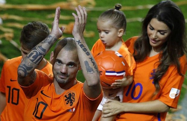 Wesley Sneijder of The Netherlands greets fans as he walks off the pitch with his wife Yolanthe, right, and his children Xess Xava, second right, en Jessey, left, as he retires from international soccer after the international friendly soccer match between The Netherlands and Peru at the Johan Cruijff ArenA in Amsterdam, Netherlands, Thursday, Sept. 6, 2018. The friendly against Peru is the 134th and last for 34-year-old Sneijder, a Dutch record. His first international was a 1-1 draw with Portugal on April 30, 2003. The attacking midfielder has played for clubs including Ajax, Real Madrid and Inter Milan. (AP Photo/Peter Dejong) AP Photo/Peter Dejong