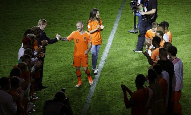 Wesley Sneijder of The Netherlands greets coach Ronald Koeman of The Netherlands as he retires from international soccer after the international friendly soccer match between The Netherlands and Peru at the Johan Cruijff ArenA in Amsterdam, Netherlands, Thursday, Sept. 6, 2018. The friendly against Peru is the 134th and last for 34-year-old Sneijder, a Dutch record. His first international was a 1-1 draw with Portugal on April 30, 2003. The attacking midfielder has played for clubs including Ajax, Real Madrid and Inter Milan. (AP Photo/Peter Dejong) AP Photo/Peter Dejong
