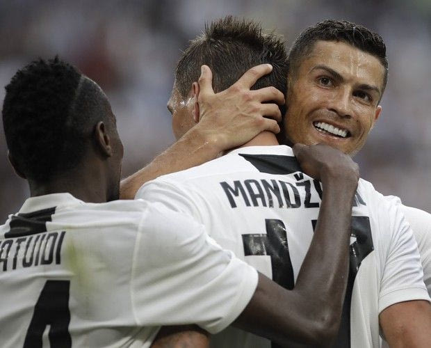 Juventus' Mario Mandzukic, is hugged by teammate Juventus' Cristiano Ronaldo, after scoring his sides second goal of the game during the Serie A soccer match between Juventus and Lazio at the Allianz Stadium in Turin, Italy, Saturday, Aug. 25, 2018. (AP Photo/Luca Bruno) AP Photo/Luca Bruno