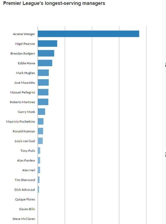 Πιο ανθεκτικός παραμένει φυσικά ο Αρσεν Βενγκέρ ο οποίος βρίσκεται στον πάγκο της Αρσεναλ τα τελευταία 19 χρόνια. Οι συνάδελφοί του στην επόμενη Πρέμιερσιπ δεν μπορούν καν να ακουμπήσουν το ρεκόρ του κάτι απολύτως φυσιολογικό.