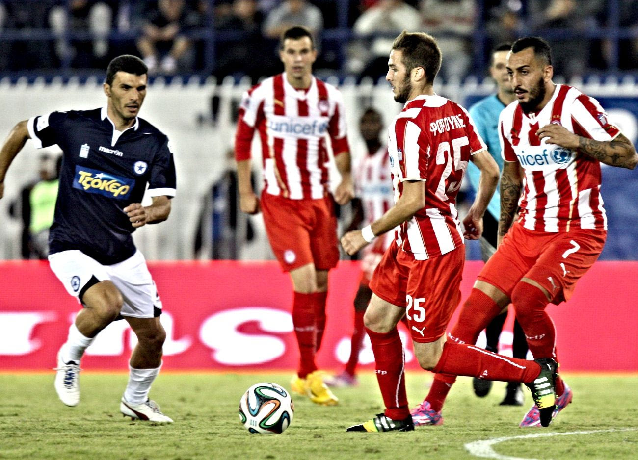 O Κώστας Φορτούνης με την μπάλα στα πόδια, ενώ παρακολουθούν οι Κώστας Μήτρογλου-Λούκα Μιλιβόγιεβιτς, κατά τη διάρκεια του Ατρόμητος-Ολυμπιακος 1-0 (27 Σεπτεμβρίου 2014). ACTION IMAGES PRESS AGENCY