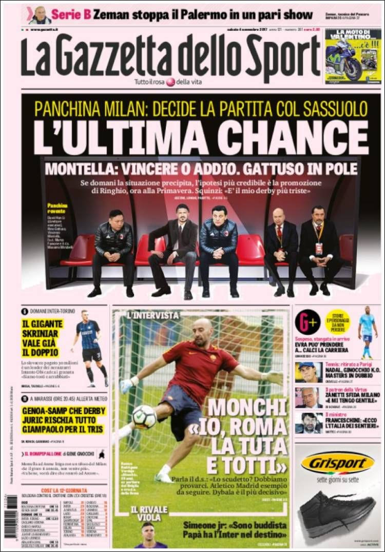 “Το ματς με την Σασουόλο κρίνει τον πάγκο της Μίλαν. Η τελευταία ευκαιρία για Μοντέλα: νικάει ή αντίο. Ο Γκατούζο φαβορί”, είναι ο τίτλος στην σημερινή “Gazzetta dello Sport” που έχει φωτογραφία-κολάζ του Μοντέλα και Γκατούζο να κάθονται δίπλα-δίπλα στον πάγκο της Μίλαν”.